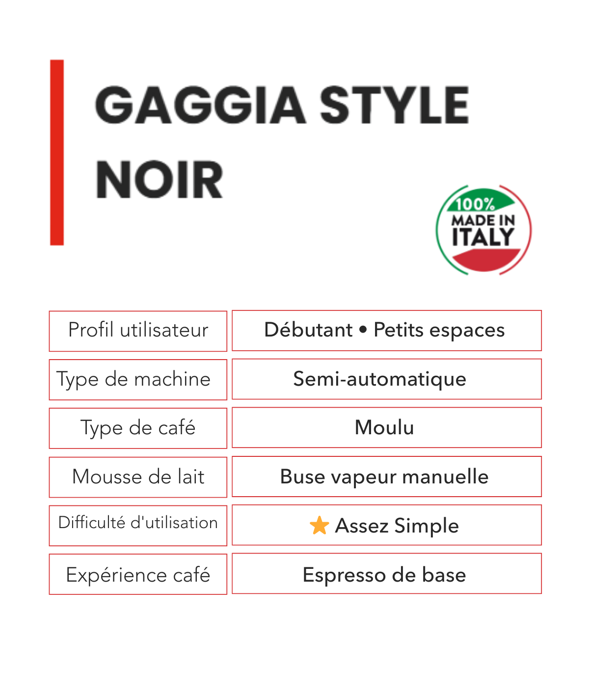 Compacte et élégante, la machine de notre partenaire, Gaggia Style Noir, s’adapte aux envies de cafés de vos clients et votre entreprise. Son réservoir de 1,2 L et ses dimensions pratiques (L 19,9 × H 30,3 × P 25,5 cm) en font un modèle idéal pour les petits espaces allant jusqu'à 5 cafés par jour.