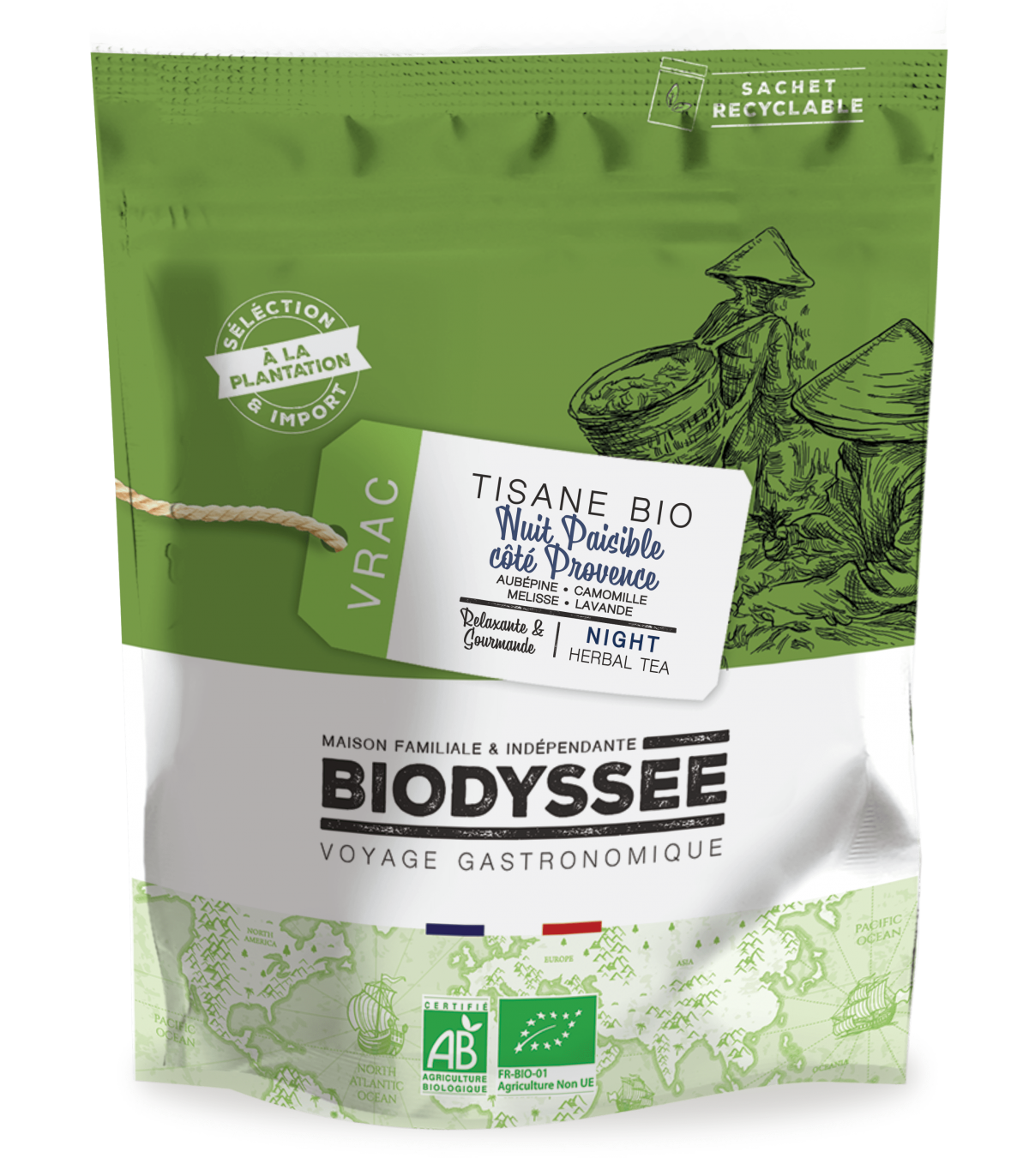 Notre tisane Nuit Paisible côté Provence bio est composée de plantes cueillies dans nos régions françaises. Elle associe les bienfaits de l’aubépine, de la camomille, de la mélisse et de la lavande pour faciliter l’endormissement et réduire le stress tout en améliorant la qualité du sommeil. Elle offre une infusion gourmande et relaxante, à consommer de préférence le soir.